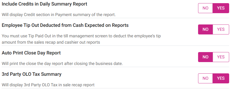 Auto Print Close Day Report – If Enabled (set to YES), the Auto Print Day Report will be automatically reset at