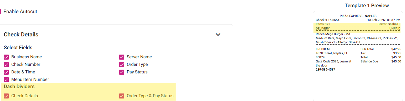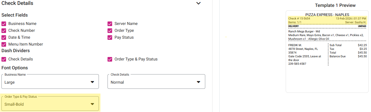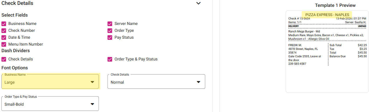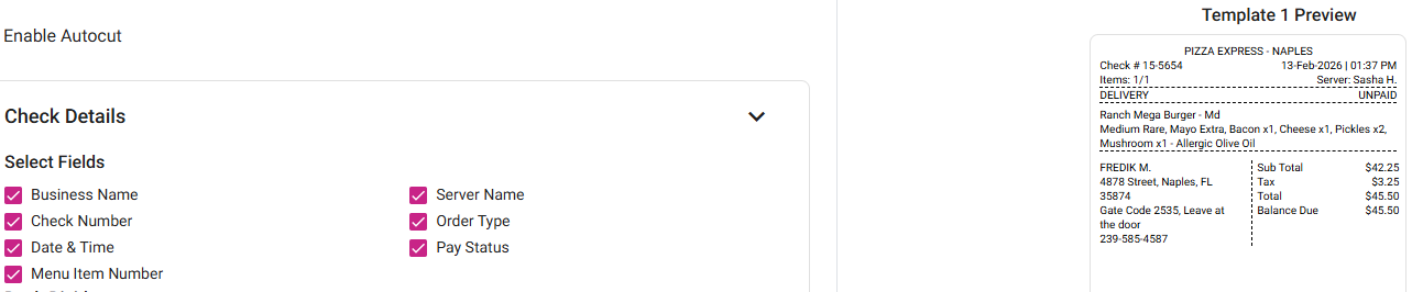 Select Fields - Click any of the following check boxes to display them on the label: Business Name, Check Number, Date & Time, Menu Item Number, Server Name, Order Type, Pay Status.