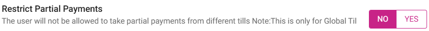Partial Payments – If Enabled (YES), partial payments can't be taken from different tills (applicable to Global