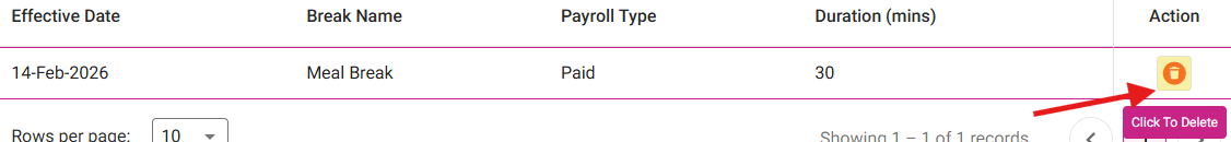 a table that has columns for a Break’s Effective Date, Name, Payroll