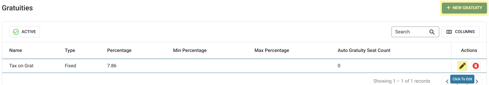 Click + New Gratuity to create a new Gratuity, or to update an existing Gratuity under the Actions column click the corresponding pencil button.