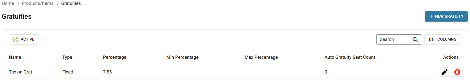 The Gratuities page displays all Gratuities currently existing under the Store.