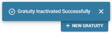 the main Gratuities page where a confirmation banner appears at the upper-right. If a new Gratuity was created, it will be added as a row in the table.