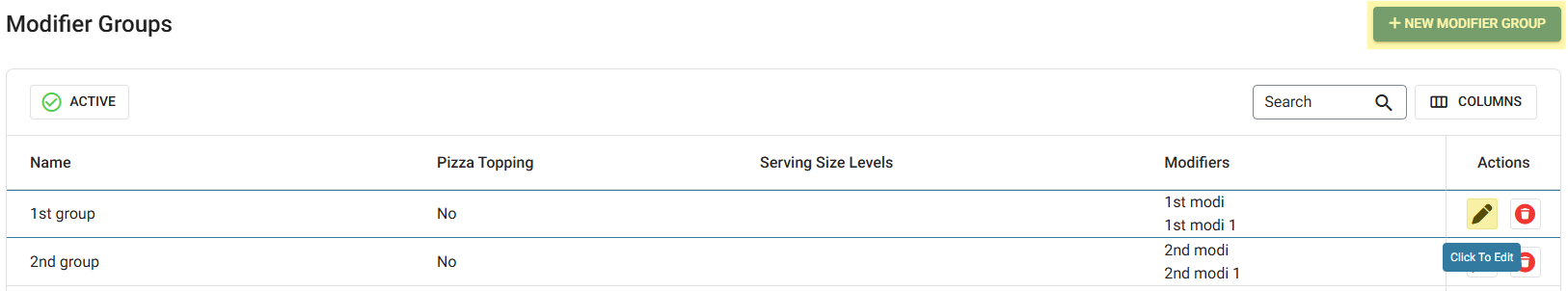 Identify the Modifier Group to be deleted (deactivated), then under the Actions column click the corresponding Trash Can button.