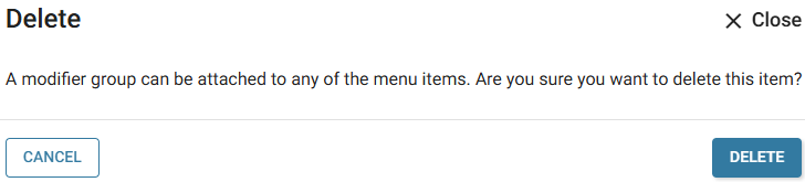 The Delete pop-up appears, with the following warning message: 'A modifier group can be attached to any of the menu items. Are you sure you want to delete this item?'. Select Delete to confirm deleting (deactivating) the Modifier Group.