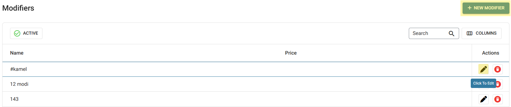 The Modifiers page displays all established Modifiers under the Store.