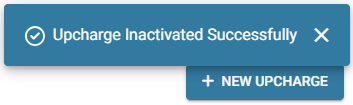 You're returned to the Upcharges page, where the Upcharge has been removed from the table (deactivated) and the confirmation banner appears at the upper-right.