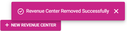 To delete a Revenue Center: under Actions select the corresponding Trash Can. Then on the Delete pop-up that appears, select Delete to confirm deleting the Revenue Center. The 'Revenue Center Removed Successfully' banner appears and the Revenue Center is removed a row on the table.