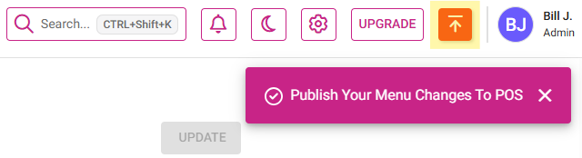 When ready, click Update at the upper-right. The 'Publish Your Menu Changes...' banner appears and the Update button is greyed out, confirming that the updates were applied. Then click the Publish button (red with white upwards-facing arrow) to apply to the POS.