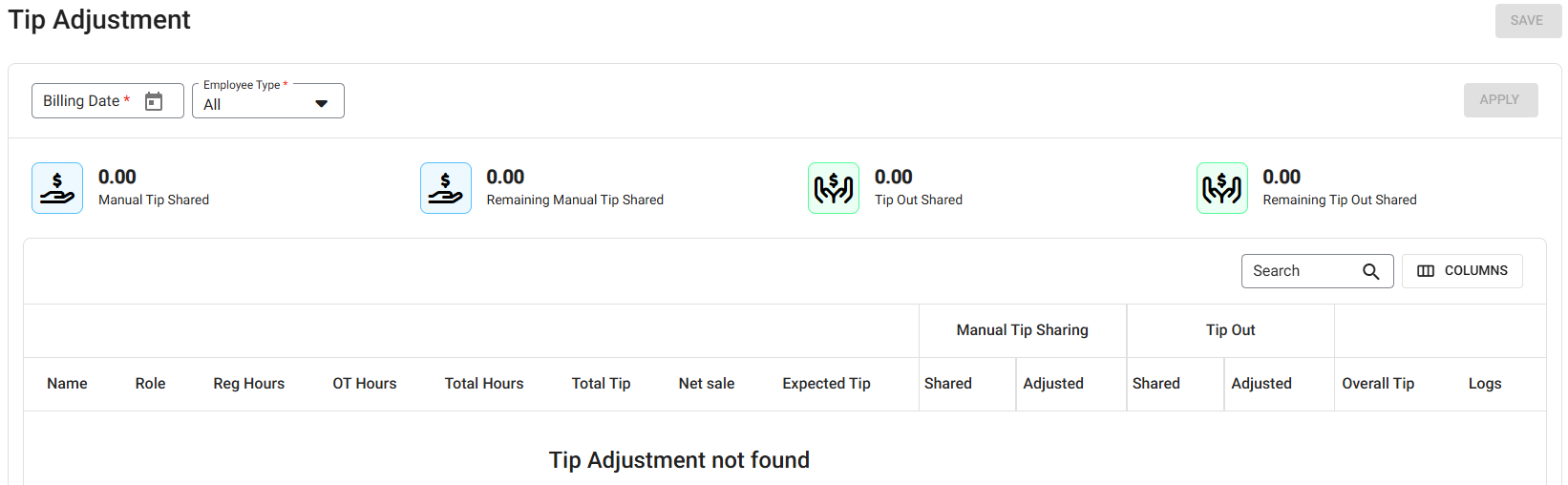the Billing Date and Employee Type, then click Apply.