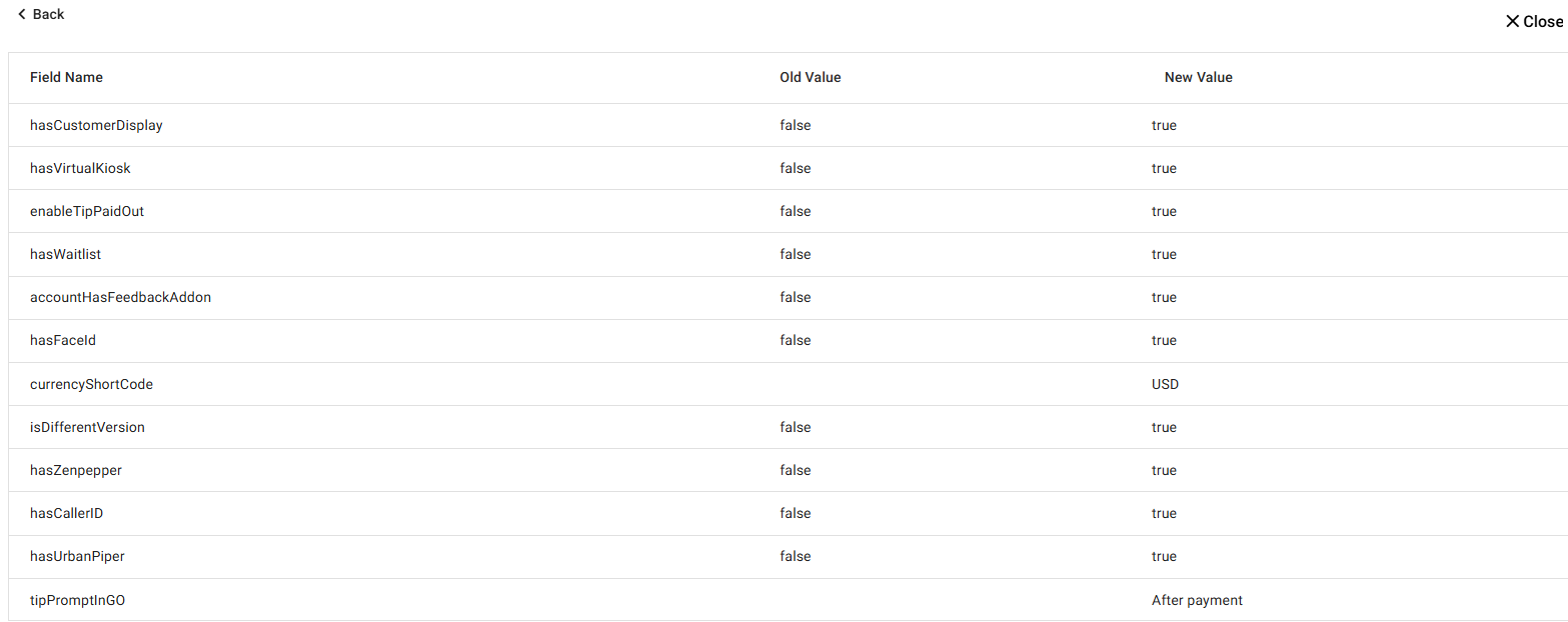 Log: The log details for the check note and which field the update has been made to (such as menu item, modifier group, user update, etc.). Clicking the value displays a new table describing the update - with columns for Field Name, Old Value, and New Value. Click the < Back button to return to the main Audit Log results.