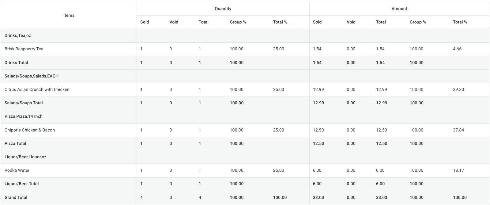 Amount: Sub headers of the amounts Sold (in currency), Void (in currency), Total (Sold Amount + Void Amount), Group % (Item Total / Group Total) and Total % (Item Total / Grand Total [at the very bottom]).