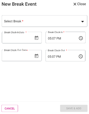 - On the New Time Event page, click + New Break. The New Break Event pane appears.