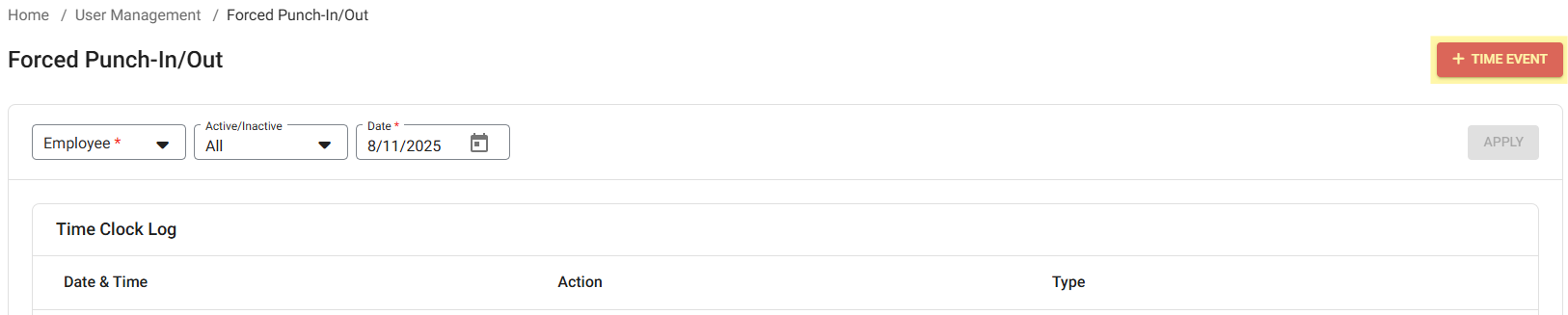 - On the Forced Punch-In/Out page, click + Time Event. The New Time Event page appears.