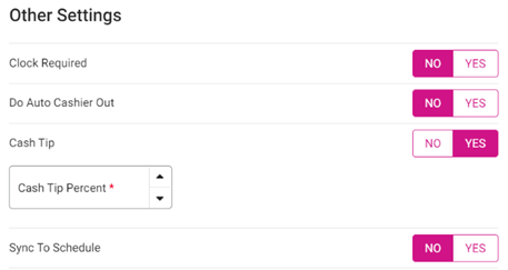 - Under the Other Settings section, Enable the Cash Tip toggle by setting it to YES.