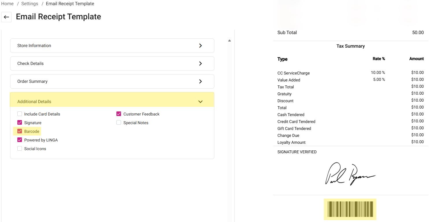 - On the Email Receipt Template settings page: select the Additional Details section.