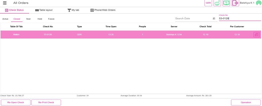 - When the Closed check tab is accessed in POS and the barcode on the Receipt of a Closed Check is scanned, then the details of that Check will appear on the Order screen in POS.