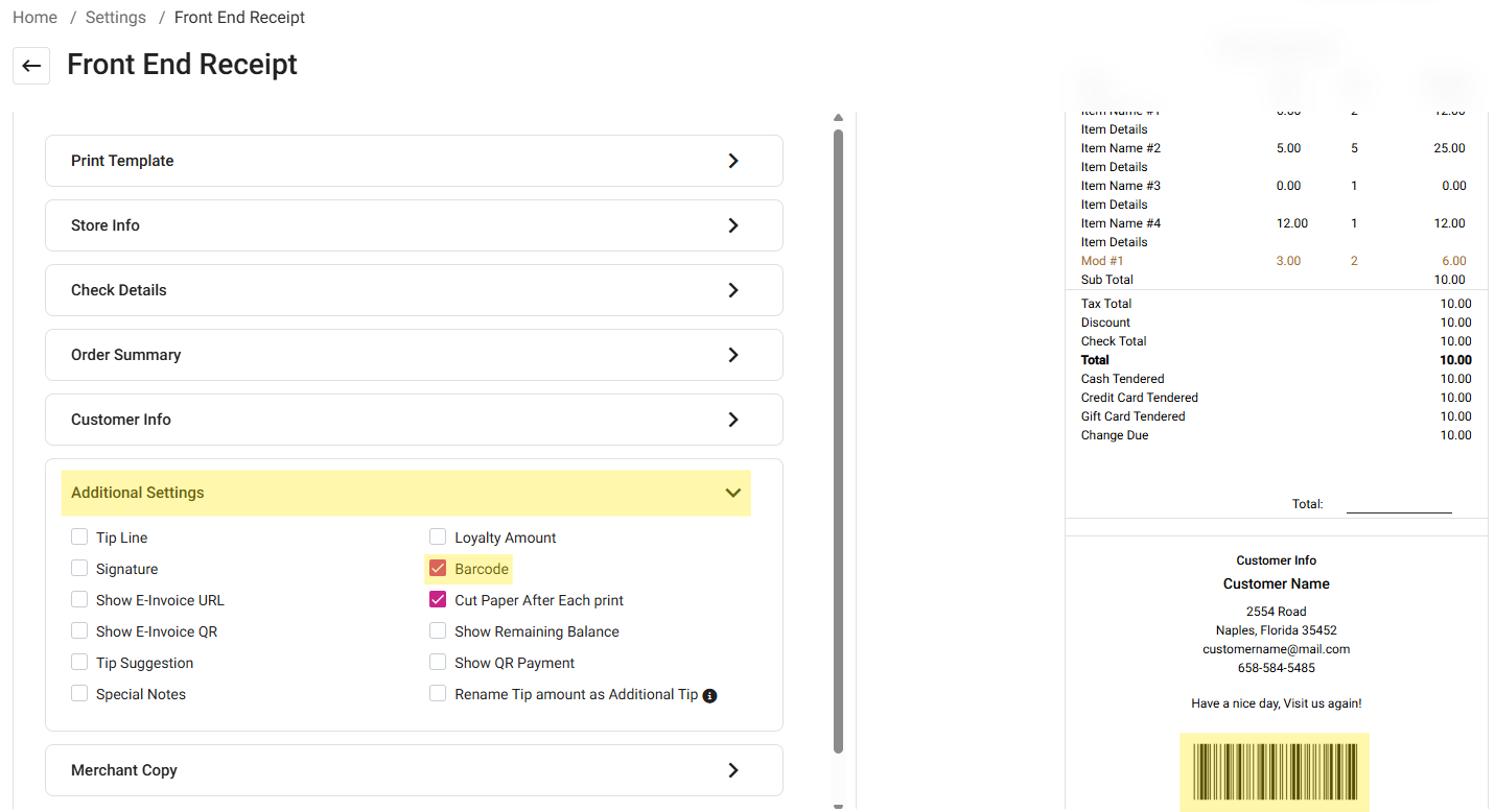 - On the Front End Receipt settings page: select the Additional Settings section.