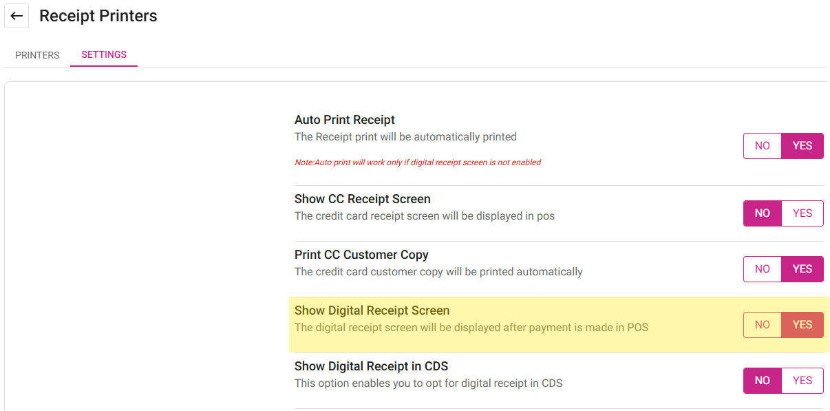 On the Receipt Printers page: the Show Digital Receipt Screen toggle appears under the Settings tab