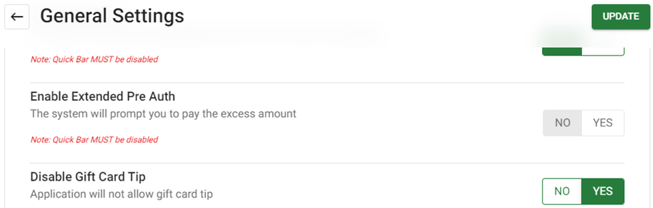 - If the Disable Gift Card Tip toggle is enabled (set to YES), a Gift Card Tip will not be allowed.