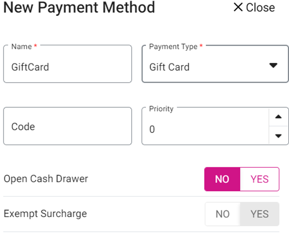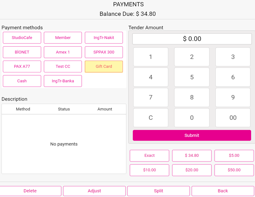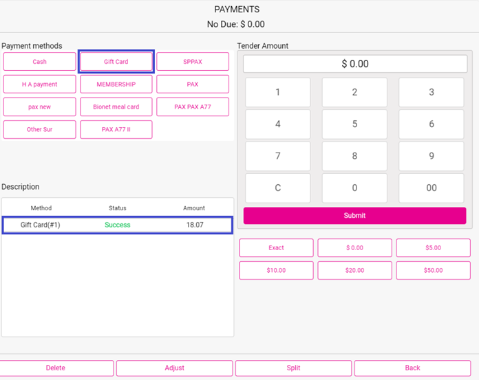 A Gift Card sold from Back Office will ask to select an option for payment.