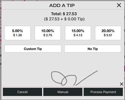 If a Tip is enabled: the Add A Tip screen appears where customers are redirected to provide a Tip in the form of Percentage (%),
