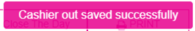 The confirmation pop-up message 'Cashier out saved successfully' appears. This confirms that closing all cashiers has successfully completed.