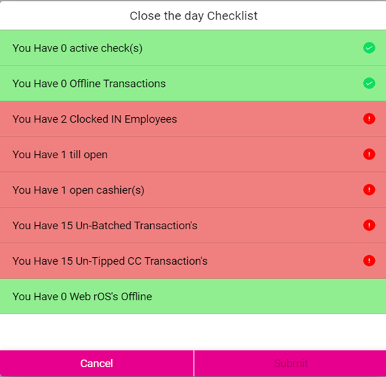 After clicking the Close The Day option, the application will validate if there are any Active Checks, Open Tills, Offline Transactions, Offline status of iPads, or Untipped transactions on the current Business Date.