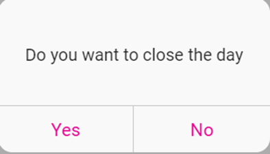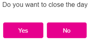 A pop-up with the message 'Do you want to close the day' with Yes and No options appears.