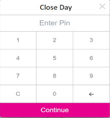 Click Yes, and the Close Day pop-up appears (manager access pop) where a Manager's 4-digit PIN must be provided.