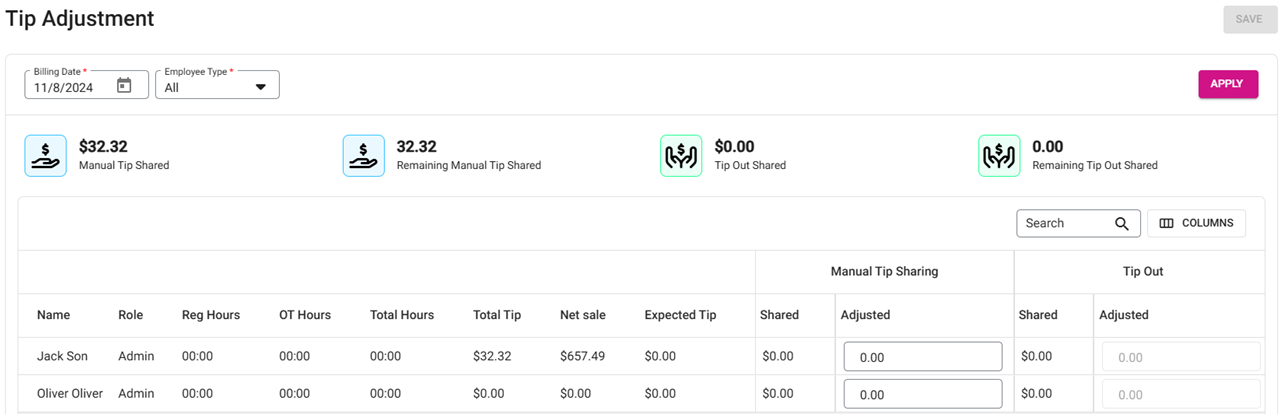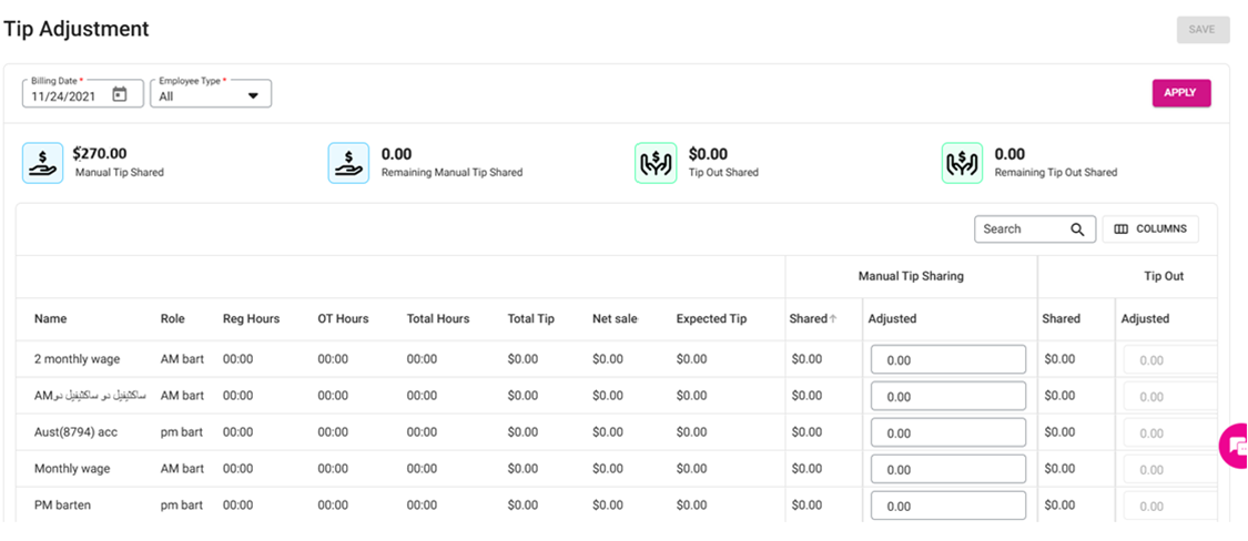 The Applied Tip amount column user can enter Tip amount that will be shared to the employee.