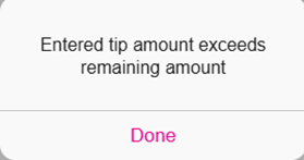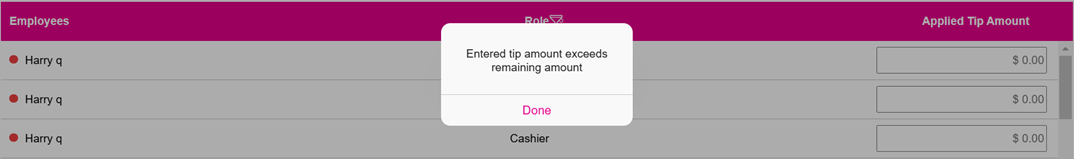 If the Allow Over Tip Out toggle is disabled:then message'Entered tip share amount exceeds the remaining amount' will appear. The system will work as-usual.