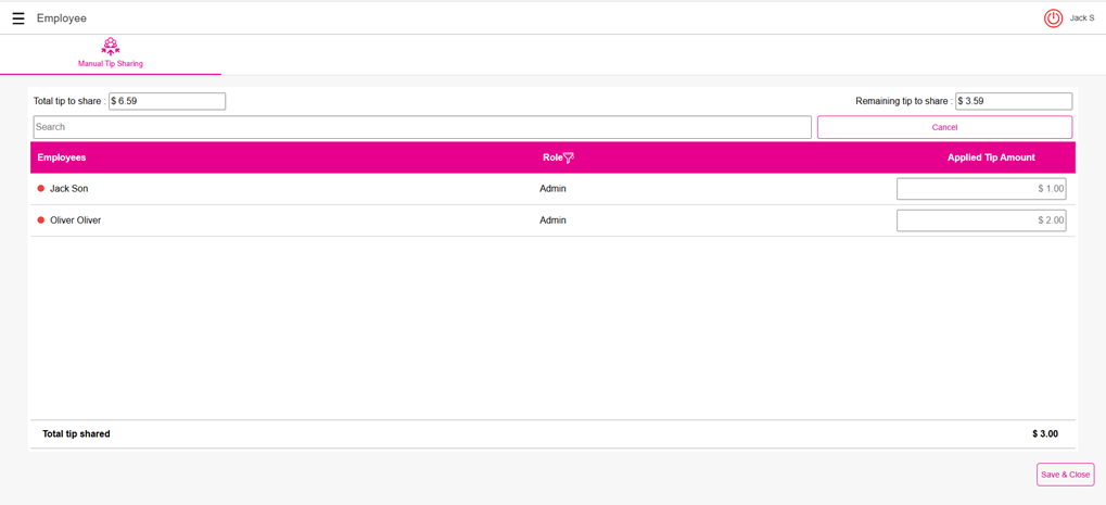 After entering the Tip amount that to be shared to the employee user can save & close by using Save & close button.