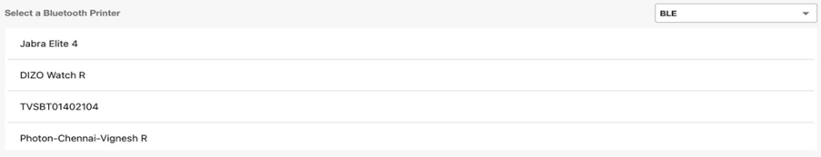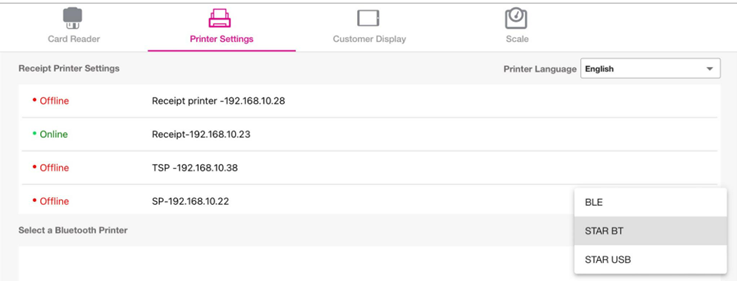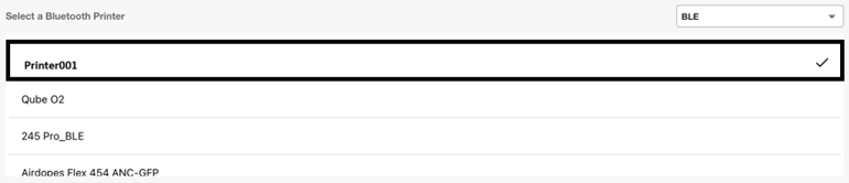 - For Bluetooth printers, the following options will be available in the dropdown by default: BLE, START BT, and STAR USB.
