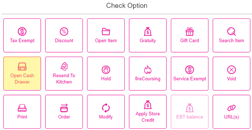 On the Check Option screen, select Open Cash Drawer. The Cash Drawer will open automatically.