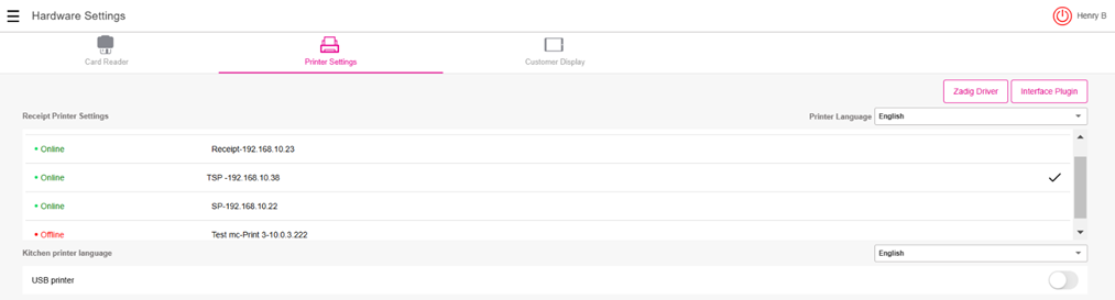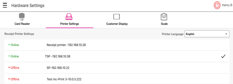 On the Hardware Settings page, select the Printer Settings tab. It displays the list of Printers configured in the Back Office - with their Status (Online or Offline), Name and IP Address.
