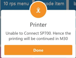 If the Kitchen Printer, Driver Printer and Label Printer are offline, then the Order will be sent to the Alternate Printer which was mapped in BO. Then the Printer pop-up with the message ‘Unable to connect [Printer Name]. Hence the printing will be continued in [Alternate Printer Name]’ appears.