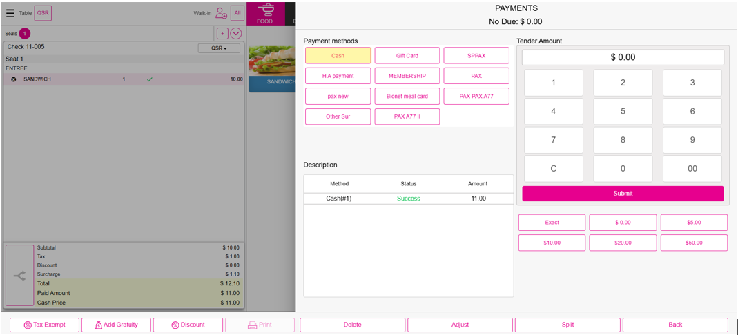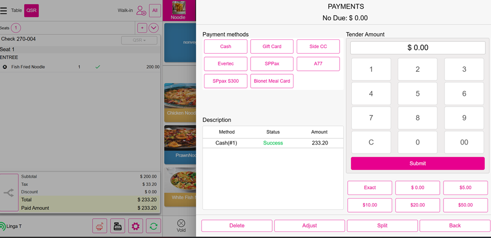 - Log in to POS, select Menu Item(s), then complete the Payment using Cash payment. The cash drawer will open automatically.