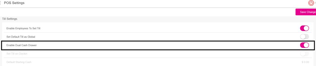 For the Enable Dual Cash Drawer toggle, it will be disabled by default. If enabled, the Dual Cash Drawer toggle will be enabled in POS.