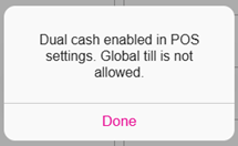 If the Global Tip is enabled, a pop-up with the message 'Dual cash enabled in POS settings. Global till is not allowed' appears.