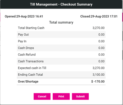 Note: The Cashier Out process will not be completed if there are any active checks or active tills.