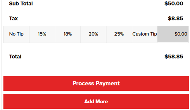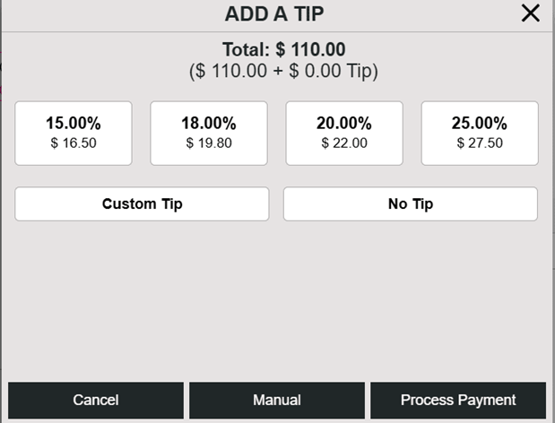 Unlike the POS screen, the exact Suggested Tip values for the Check won’t appear, but upon selecting the Tip Percentage it will appear in the Order Summary.