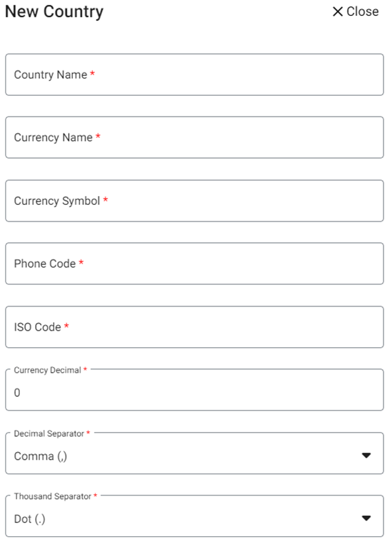 Click + New Currency to create a new Country, or under Actions click the corresponding Edit (pencil) icon of an existing Country to update it. The New/Update Country pane appears.