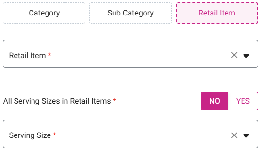 Retail Item – Select the Retail Item from the dropdown. Select whether the Discount applies to All Serving Sizes for the selected Retail Item, and if No then select the Serving Size(s) from the dropdown.