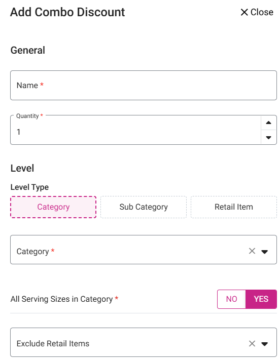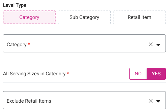 Category – Select the Category from the dropdown. Select whether the Discount applies to All Serving Sizes in the Category, and if No then select the Serving Size(s) from the dropdown. If necessary, select the Retail Items to Exclude.
