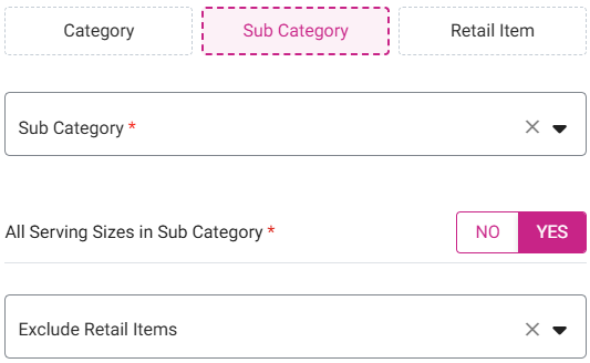 Sub Category – Select the SubCategory from the dropdown. Select whether the Discount applies to All Serving Sizes in the selected Sub Category, and if No then select the Serving Size(s) from the dropdown. If necessary, select the Retail Items to Exclude.