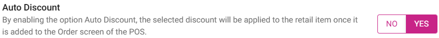 Auto Discount - If enabled (YES), the Discount will automatically be applied once an eligible Item is added to the Order.