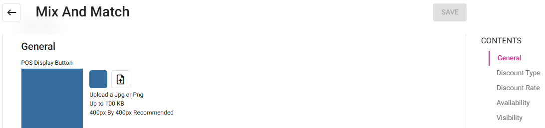 Click the + New Discount button at the upper-right. The Mix and Match screen appears, broken down by the following Contents: General, Discount Type, Discount Rate, Availability, and Visibility.